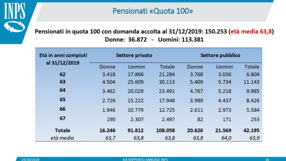 Al 31 dicembre 2020, i pensionati italiani erano pari a circa 16 milioni, di cui 7,7milioni uomini e 8,3 milioni donne. Nonostante le donne pensionate siano la maggioranza, le pensioni medie mensili degli uomini (pari a 1.897 euro) superano significativamente quelle delle donne (pari a 1.365).