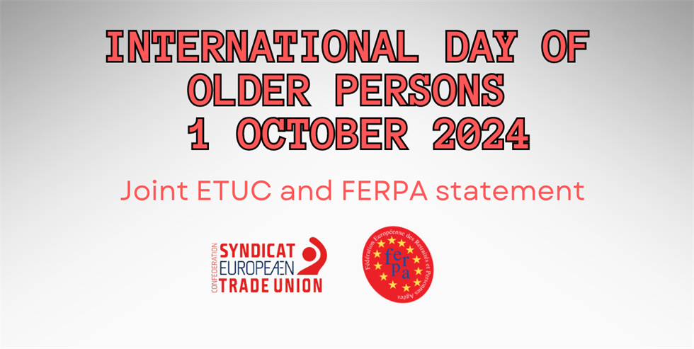 "In occasione della Giornata internazionale delle persone anziane del 1° ottobre 2024, la Federazione europea dei pensionati e degli anziani (FERPA) e la Confederazione europea dei sindacati (CES) desiderano ricordare e sottolineare il ruolo e il posto dei pensionati in Europa.