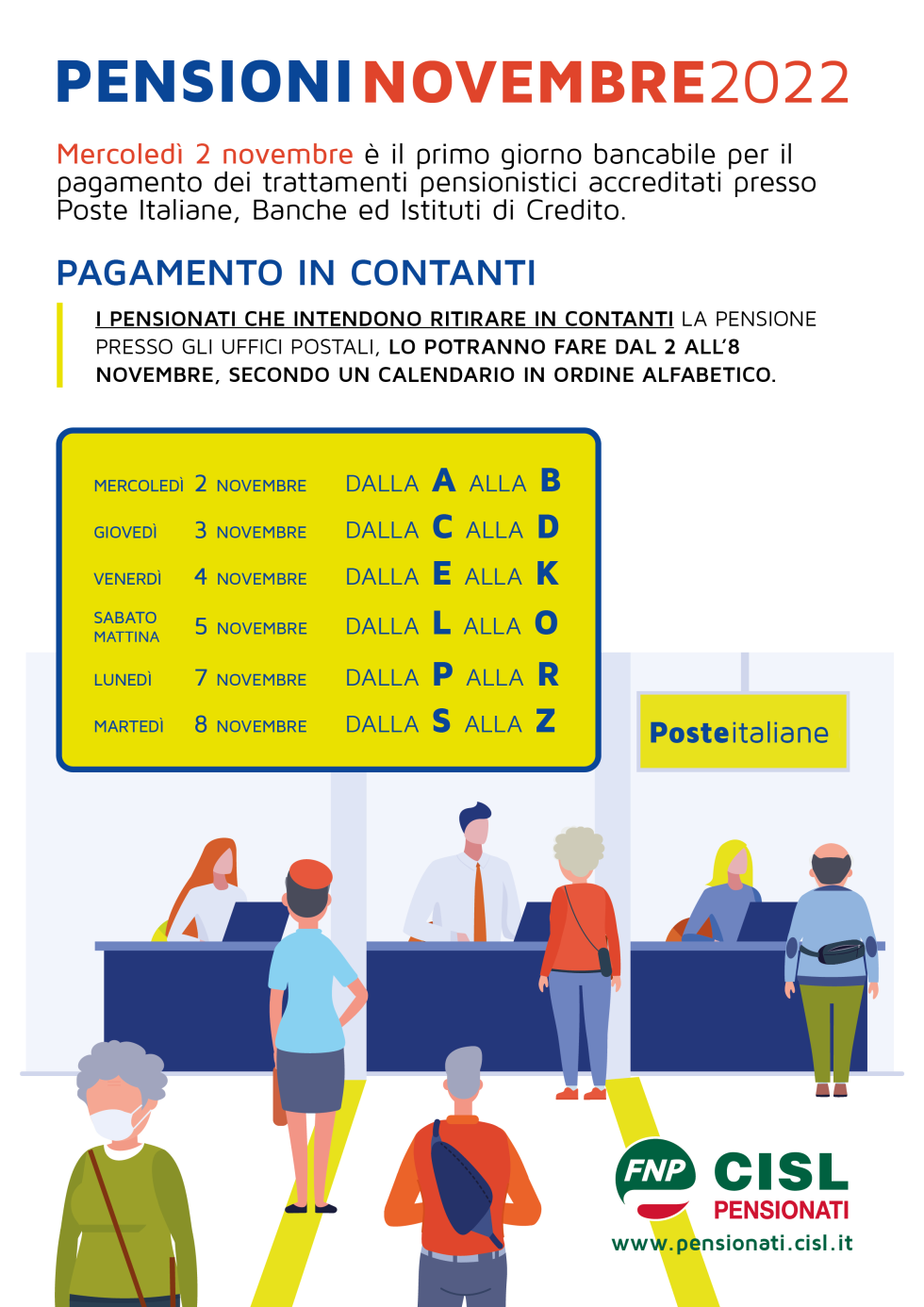 Il primo giorno bancabile del mese sarà mercoledì 2 novembre. Nel mese di novembre il 1° corrisponde alla festività di Ognissanti e, pertanto, banche e uffici postali saranno chiusi su tutto il territorio nazionale.