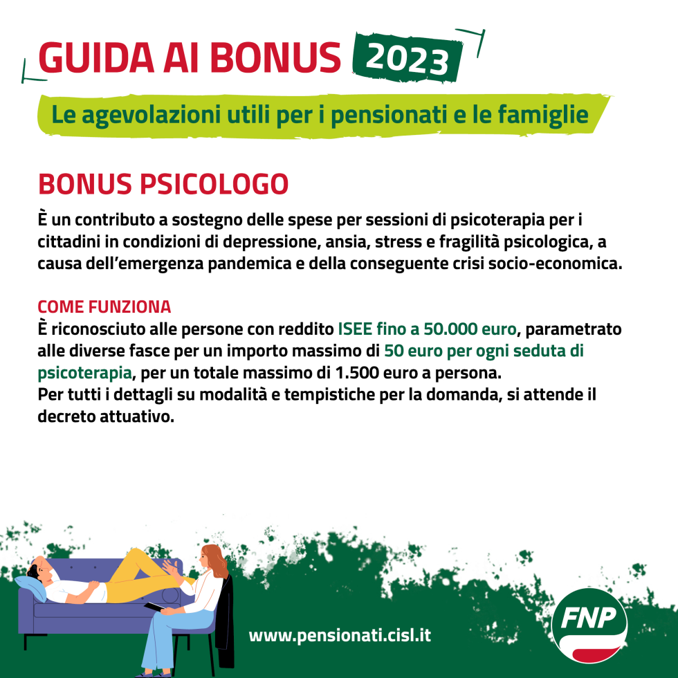 Il Bonus Psicologo 2022 è un contributo destinato a tutti coloro che si trovano in stato di stress, ansia, depressione o fragilità psicologica. È riconosciuto per un importo massimo di 50 euro per ogni seduta di psicoterapia ed è erogato fino a concorrenza della somma massima assegnata, parametrata ai valori ISEE. La Legge di bilancio 2023 ha innalzato l’importo massimo da 600 a 1.500 euro a persona.