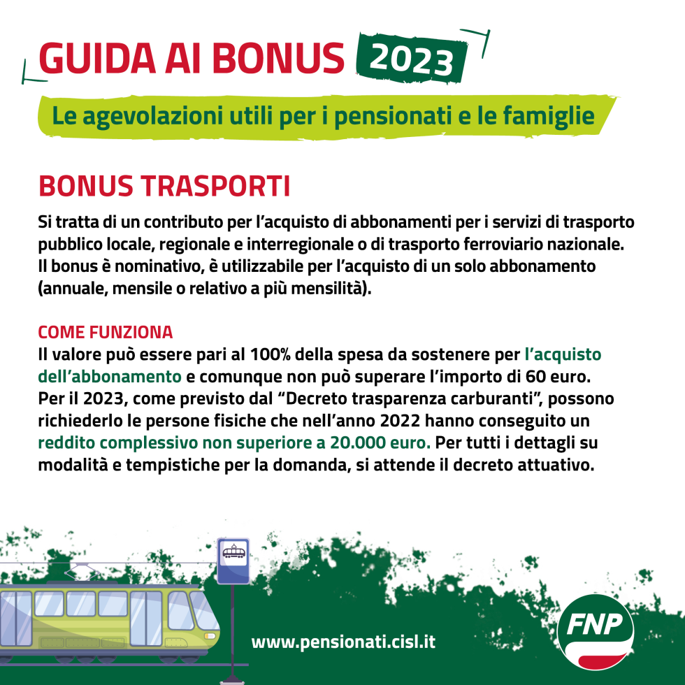 Anche nel 2023 è attivo il Bonus trasporti, l’agevolazione è stata rinnovata fino al 31 dicembre 2023. Il bonus trasporti pubblici è un contributo erogato a tutti coloro che sottoscrivono abbonamenti per i servizi di trasporto pubblico e di trasporto ferroviario nazionale.
