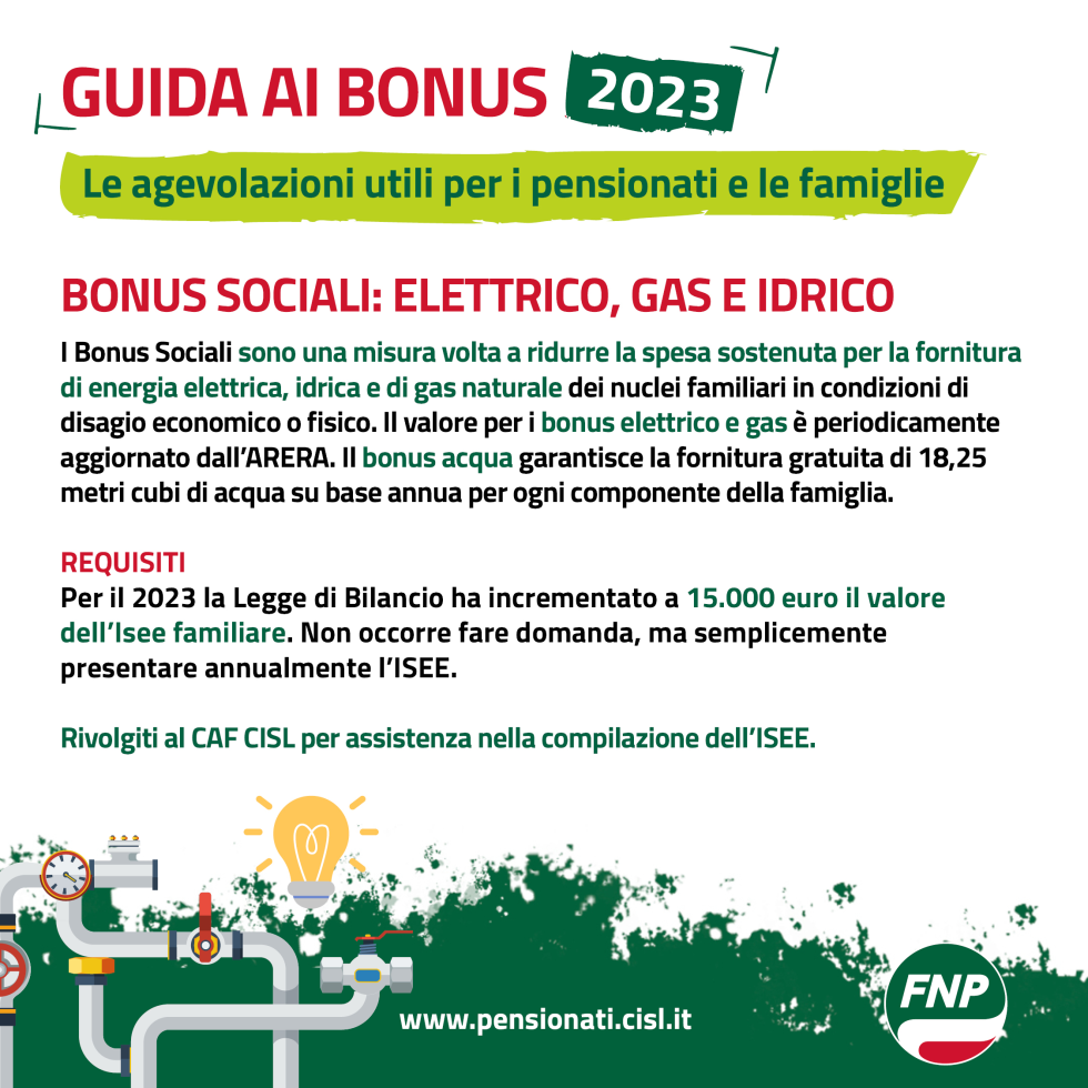 I Bonus Sociali Elettrico, Gas e Idrico sono una misura volta a ridurre la spesa sostenuta per la fornitura di energia elettrica, di gas naturale e idrica dai nuclei familiari in condizioni di disagio economico o fisico.
